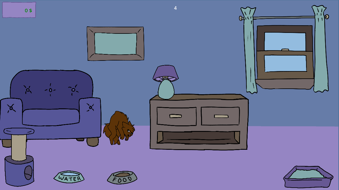 Click the food and water bowls to fill them, and click the litter box to clean it.